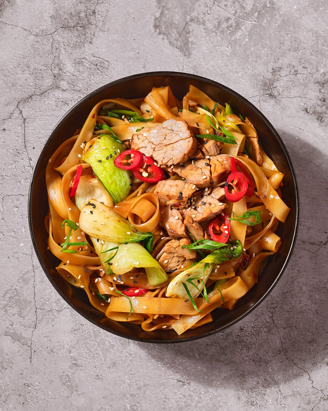 XL Rīsu nūdeles, Char Siu cūkgaļa, Ķīnas kāposti, slepenā mērce, zijas garšaugi un svaigs čilli.