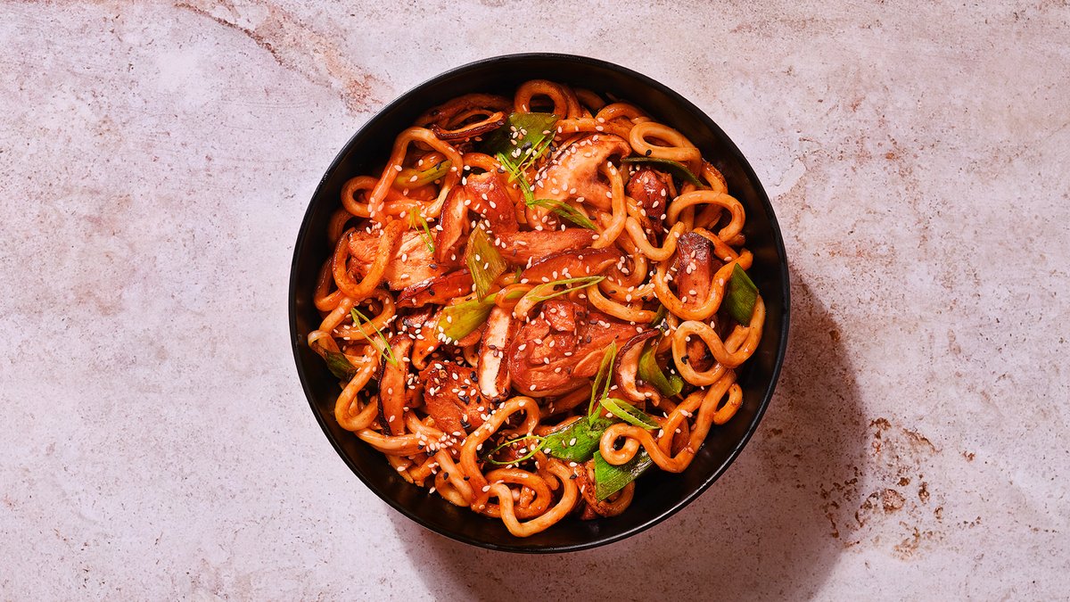 Udon nūdeles (kopā ar kāpostiem, burkāniem un olu) + Vistas gaļa + Ķīnas kāposti + Šitaki sēnes + Sezama sēklas + Austeru mērce
