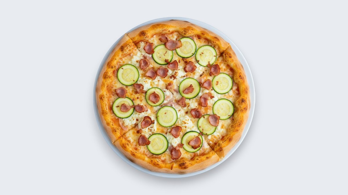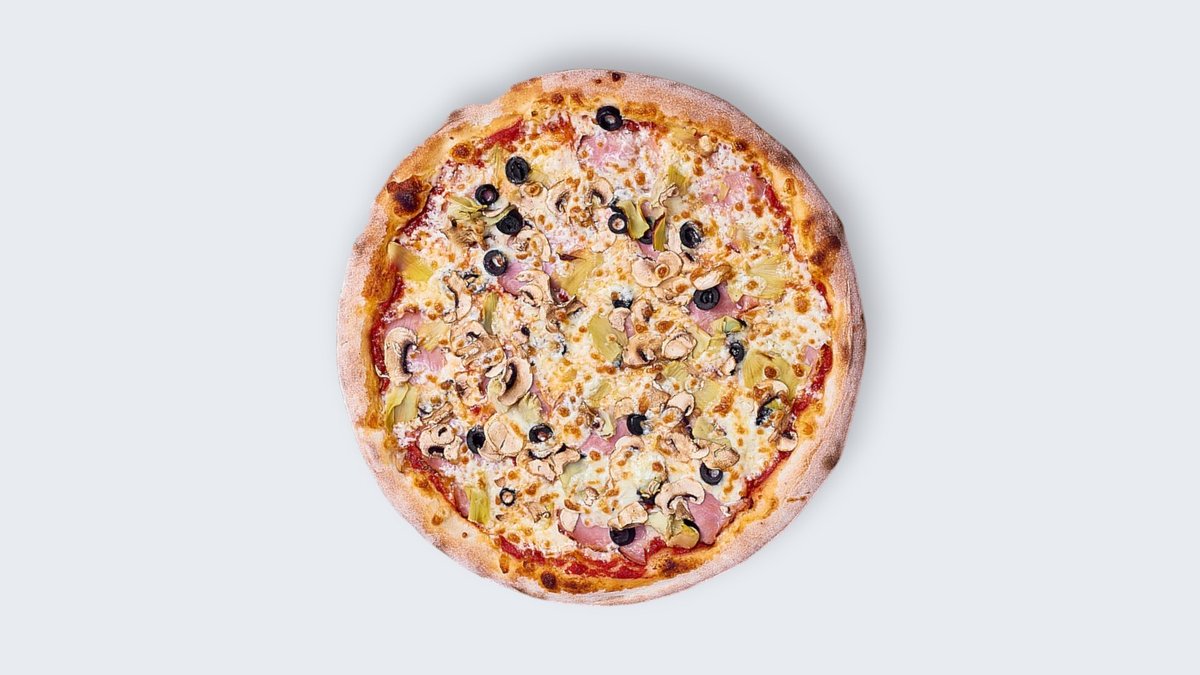 доматен сос, кашкавали, шампињони, тиквички, шери домати, маслинки