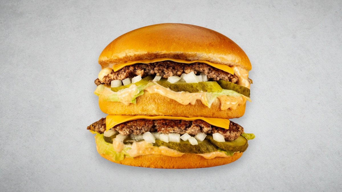 Бриош лебче, ајсберг, кисели краставици, ситно сецкан кромид, биг мек сос, 2х смеш плескавици, 2х чедар, помфрит, пијалок