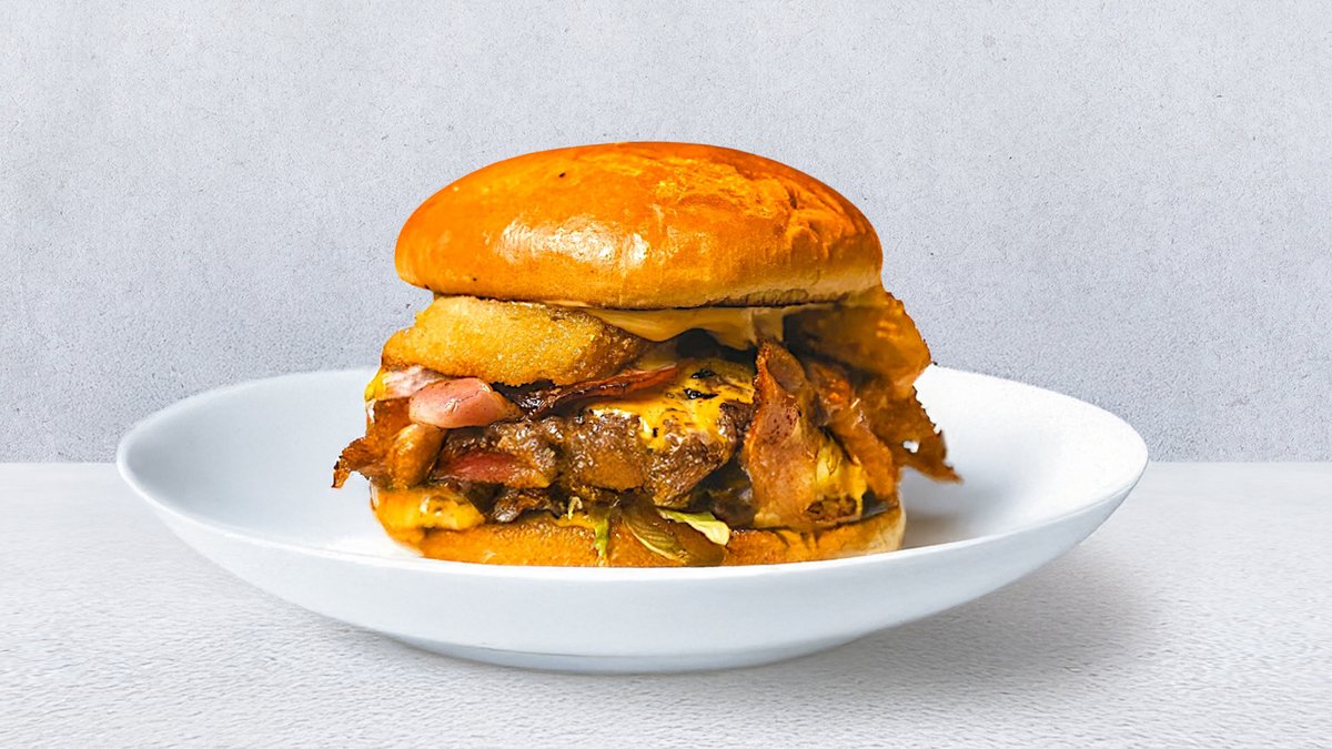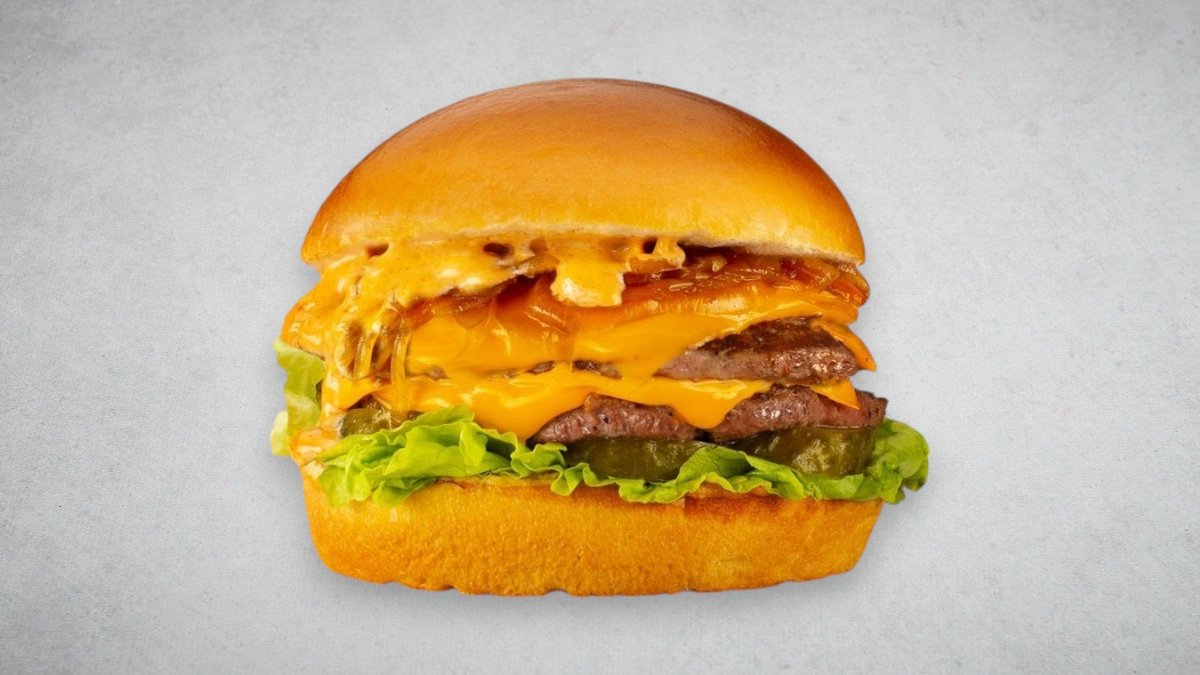 Бриош лебче, бургер сос, ајсберг, кисели краставици, 2х смеш плескавици, 2х чедар, смеса од лук, 3х онион рингс, помфрит, пијалок
