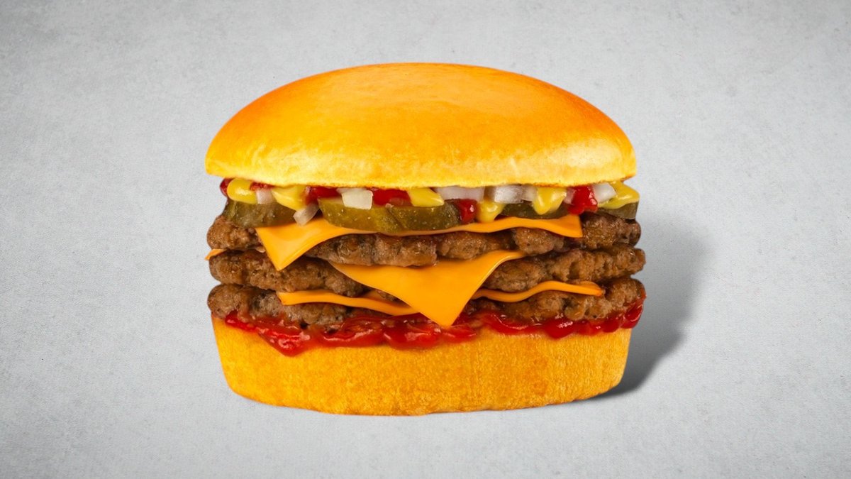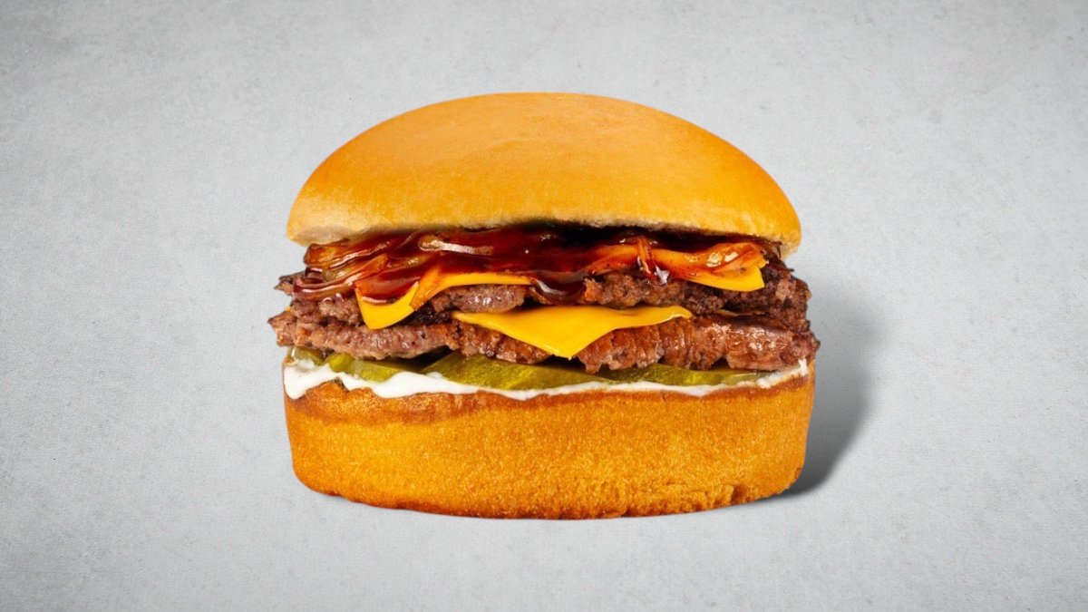 Бриош лебче, бургер сос, ајсберг, кисели краставици, 2х смеш плескавици, 4х чедар, карамелизиран кромид, помфрит, пијалок