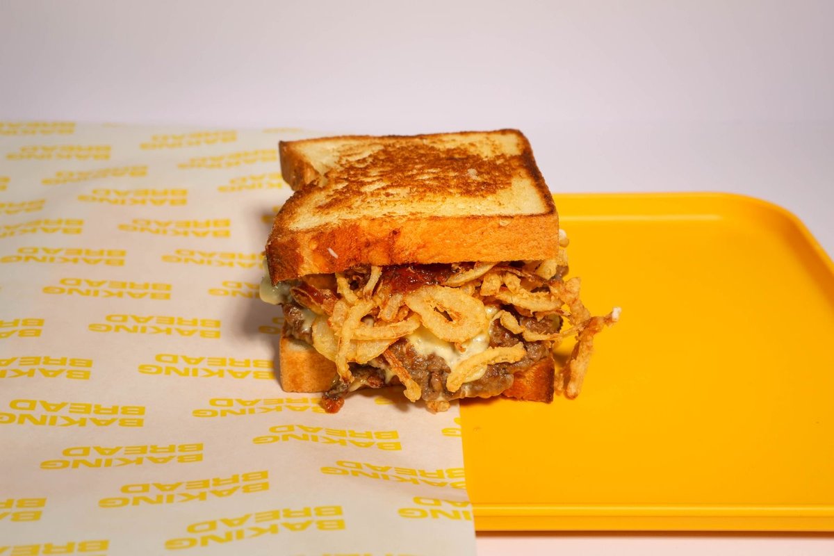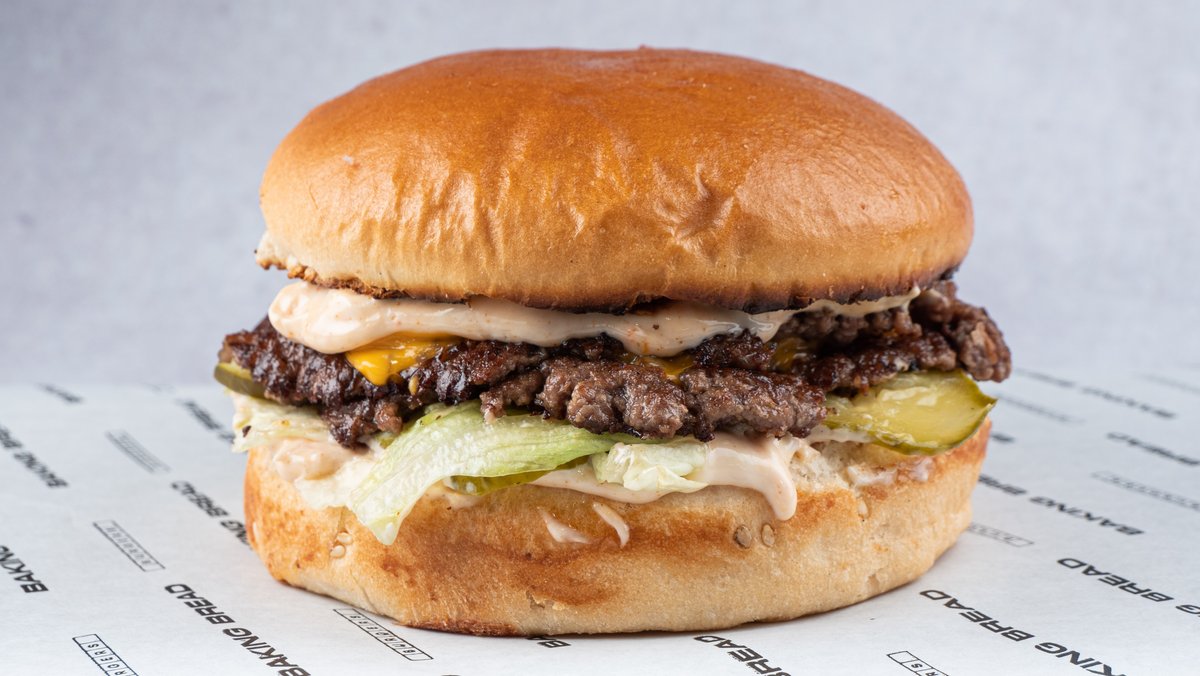Бургер лепче, бејкинг бред сос, говедска плескавица полнета со гауда кашкавал, кисели краставички, халапено пиперчиња, похован кромид, помфрит, пијалок