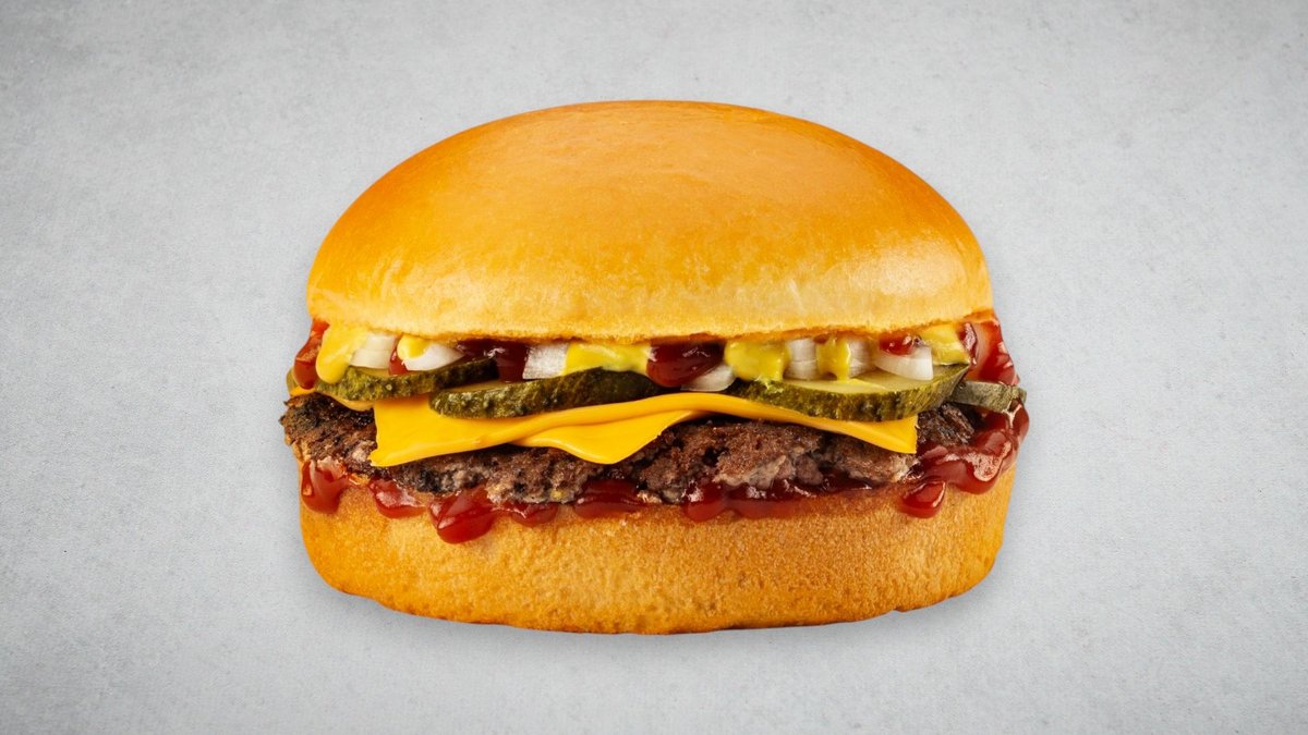 Бриош лебче, кисели крастсвици, ситно сецкан кромид, кечап, сенф, смеш плескавица, чедар, помфрит, пијалок