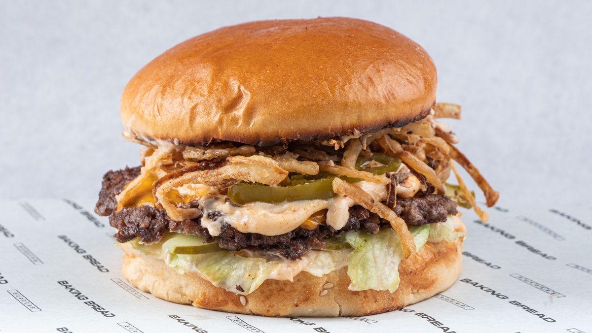 Бриош лебче, бејкинг бреад сос, кисели краставици, 2х смеш плескавици, моцарела, jalapeño пиперчиња, похован кромид, помфрит, пијалок
