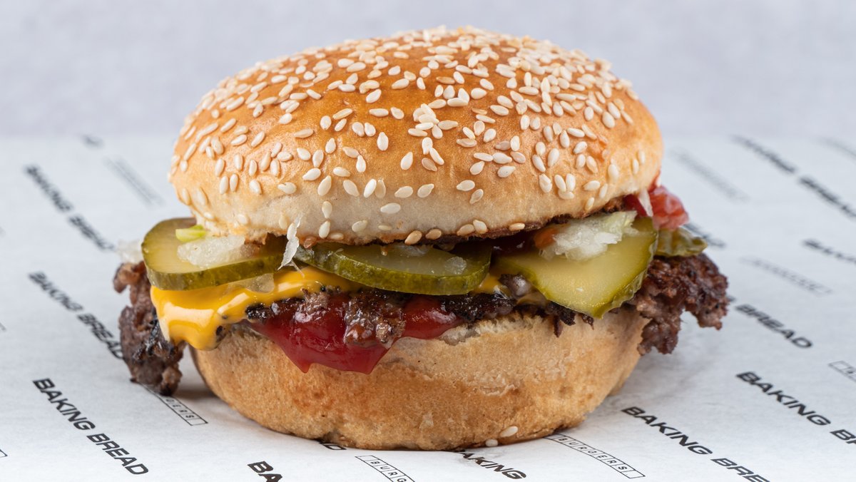 Бриош лебче, бургер сос, ајсберг, кисели краставици, веганска плескавица, чедар, карамелизиран кромид
