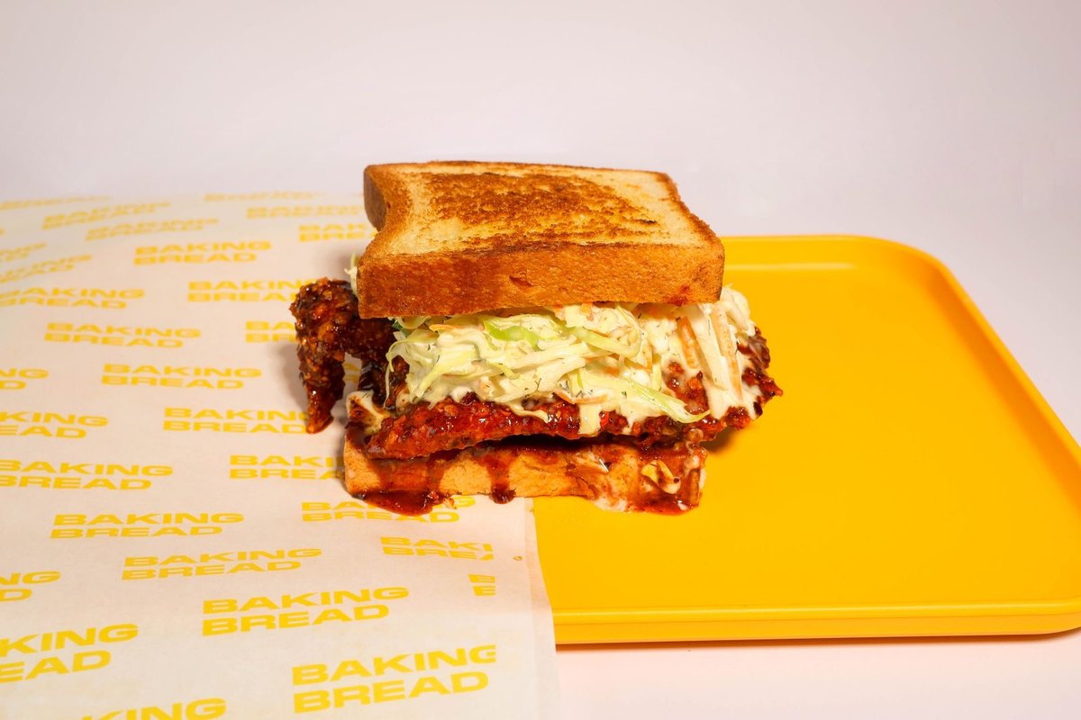 Бриош леб на кришки, путер, бејкинг бред сос, ајсберг, кисели краставици, 3х моцарела кашкавал, поховано пилешко, помфрит, пијалок