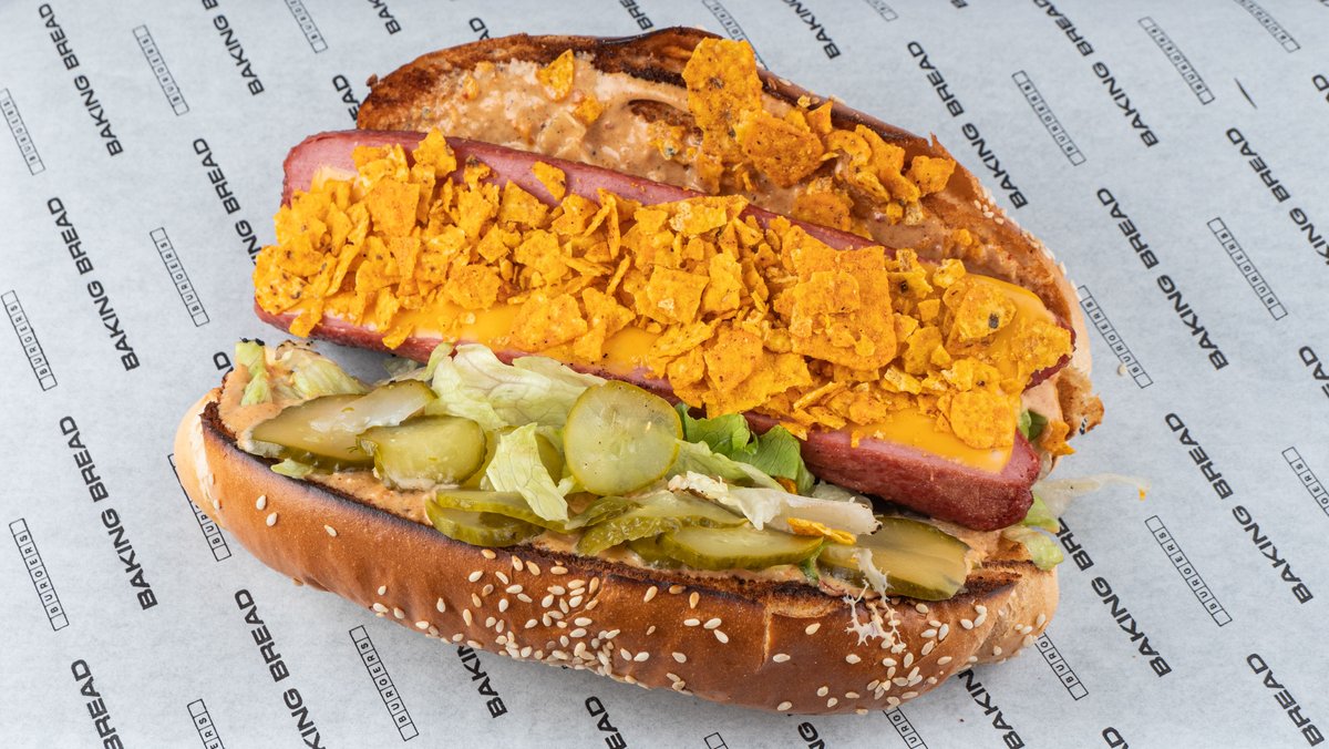 Хот дог лепче, Woody пилешка виршла, чили сос, чедар кашкавал, ајсберг, кисели краставички, доритос лут чипс