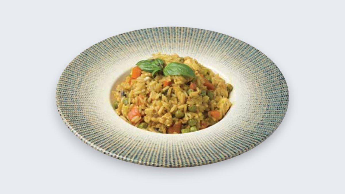 Ориз, пилешко месо, морков, тиквици, шампињони, грашок, кари, соја сос