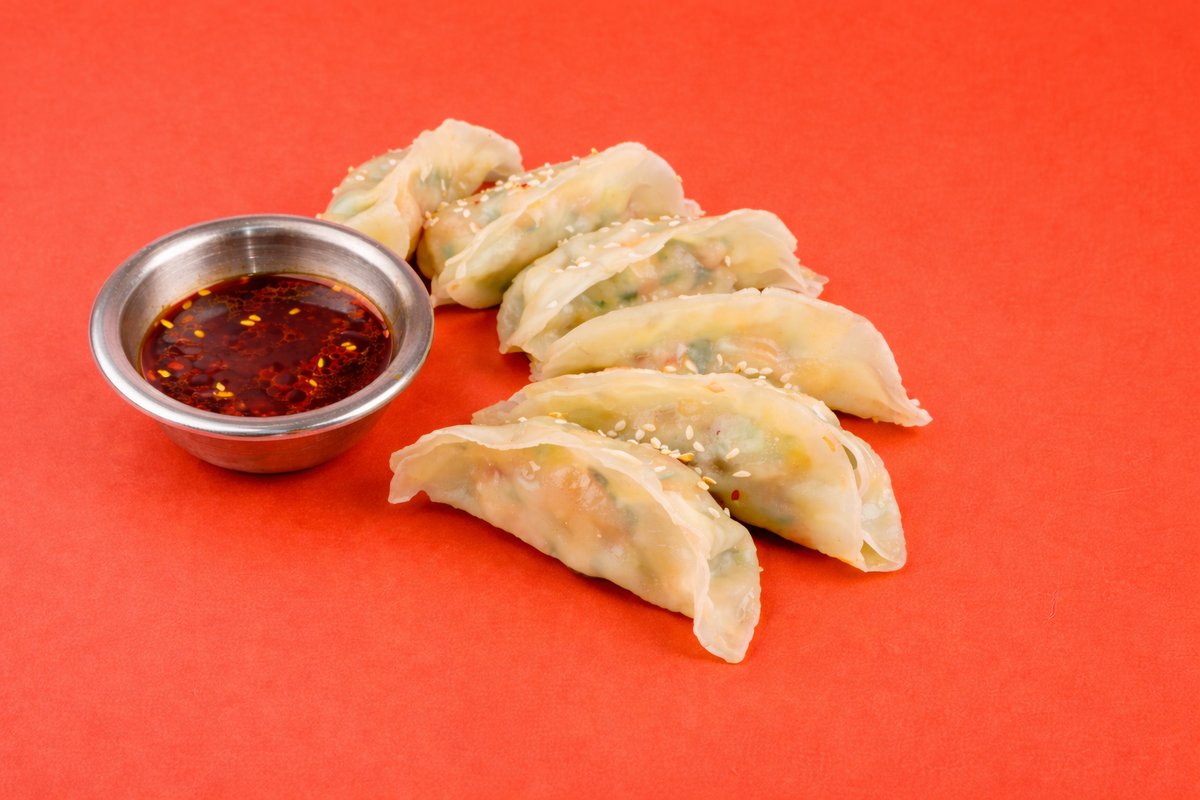 Златно запечени гиоза со ракчиња и свеж сезонски зеленчук — зелка, власец, млад кромид и пржен лук — зачинети со сусамово масло, лук и ѓумбир. Завиткани во нежно тесто од пченица и послужени со кисело-лут сос од соја, сусам, ѓумбир и гоџуџанг.