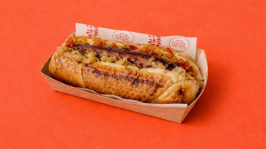 Димен тенок колбас полнет со кашкавал во потпечена млечна кифла во придружба на модерен подварок,домашен зеленчуков релиш, и домашен барбекју сос.