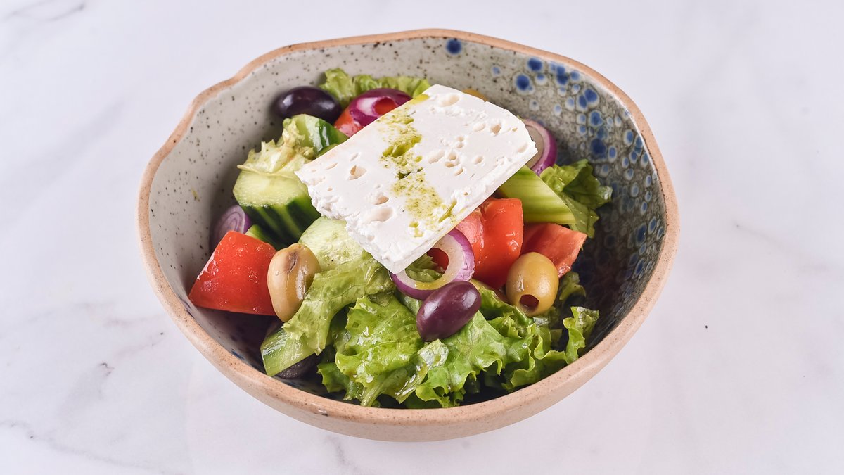 300гр. шери, краставица, црвен кромид, маслинки, марула, овчо сирење