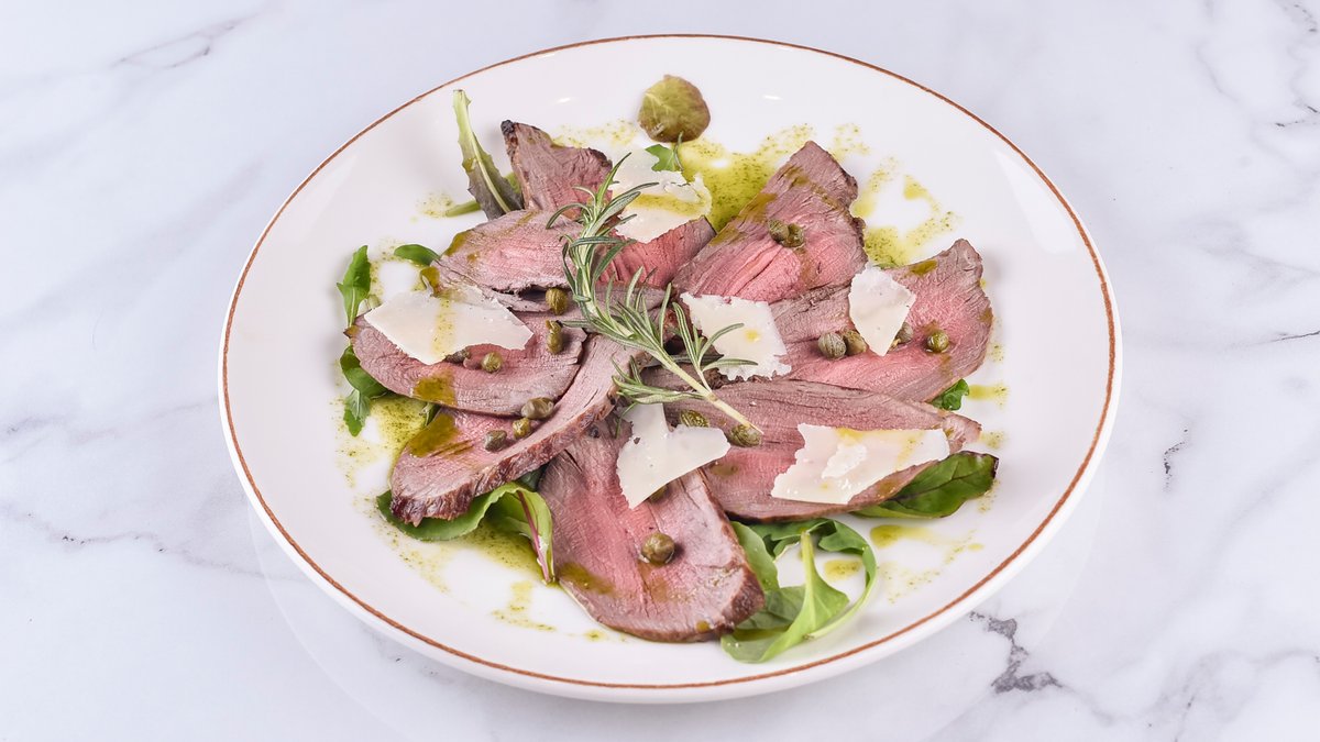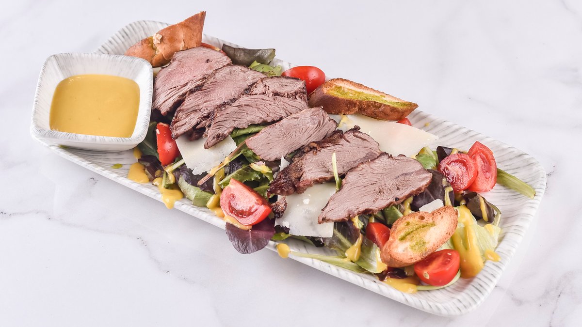 400гр. бифтек 100гр, микс салата, шери, сос со мед и сенф, пармезан и брускета