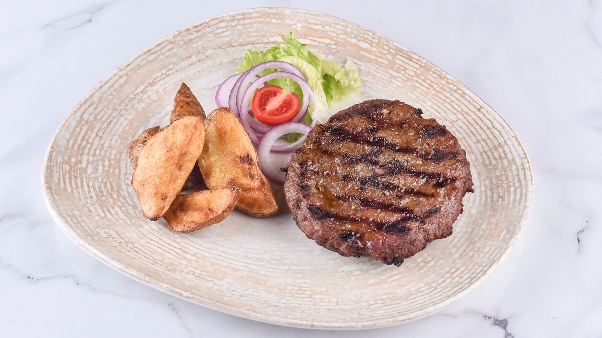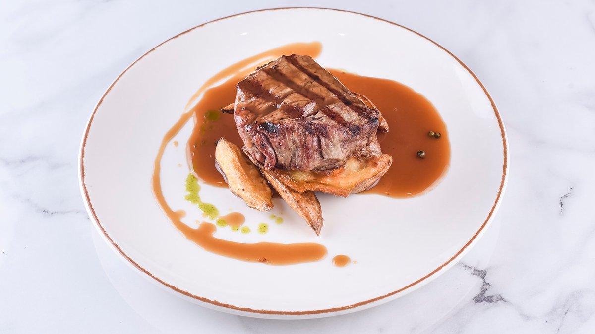 300гр бифтек, 250гр пекарски компир и 70гр сос од зелен бибер