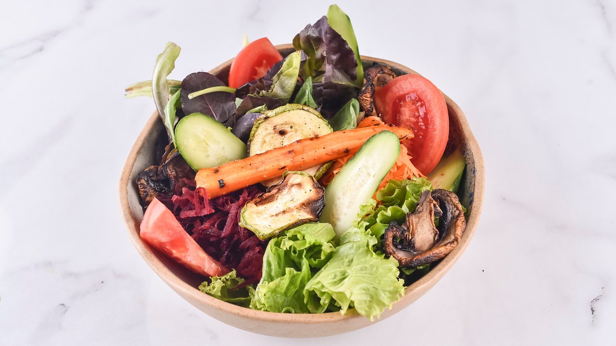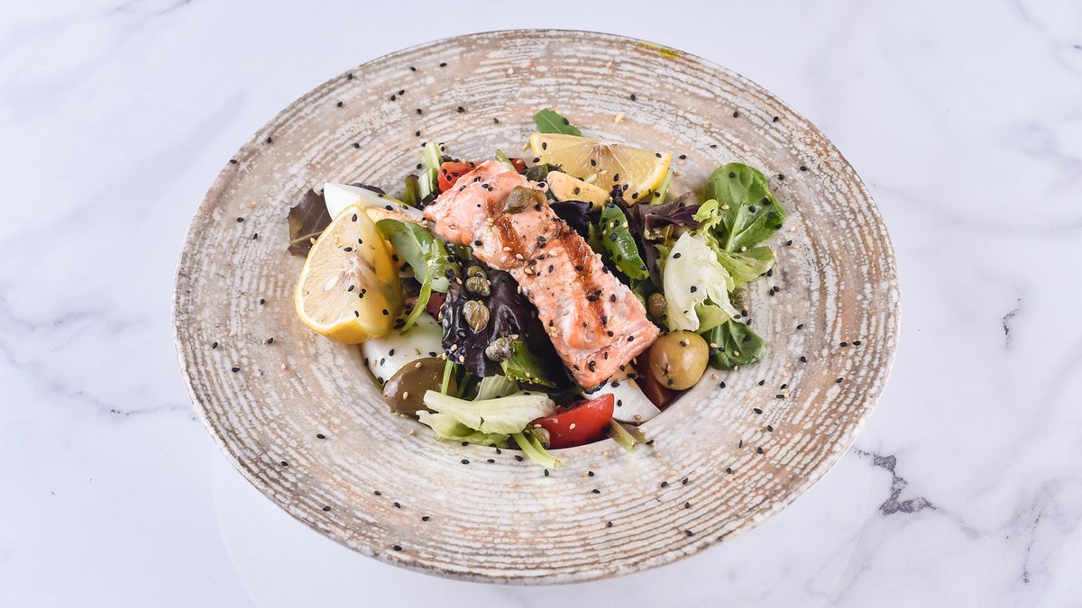 400гр. лосос 60гр., микс зелена салата, варено јајце, шери, сусам, дресинг