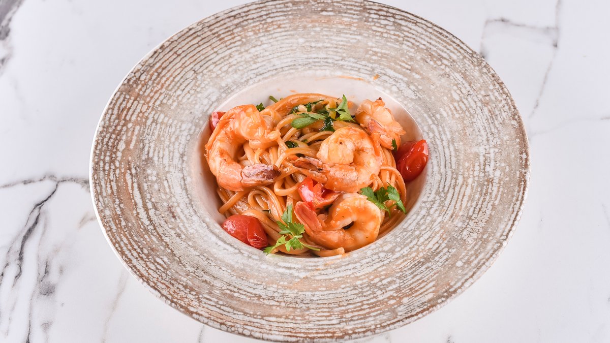 300гр. лингвини, гамбори, шери, лук, бибер, сол