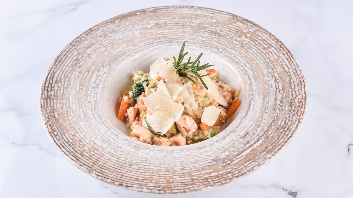 445гр. рижото, пилешко, брокула, морков, тиквица, бујон, пармезан, тиквица, путер