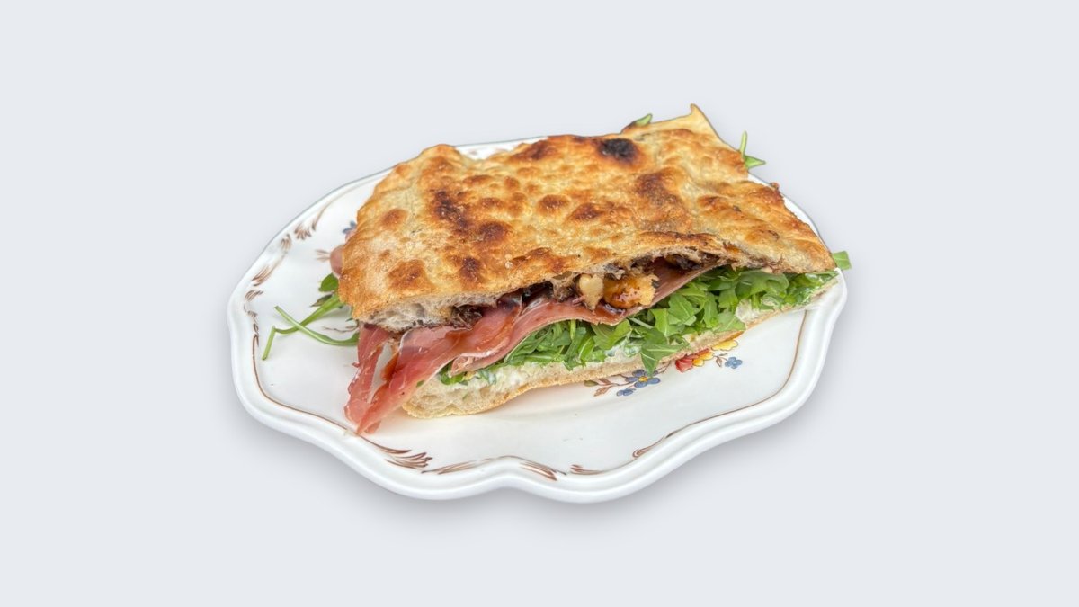 Фокача, салама, пекорино крем, карамелизиран кромид, џем од кајсија, рукола.