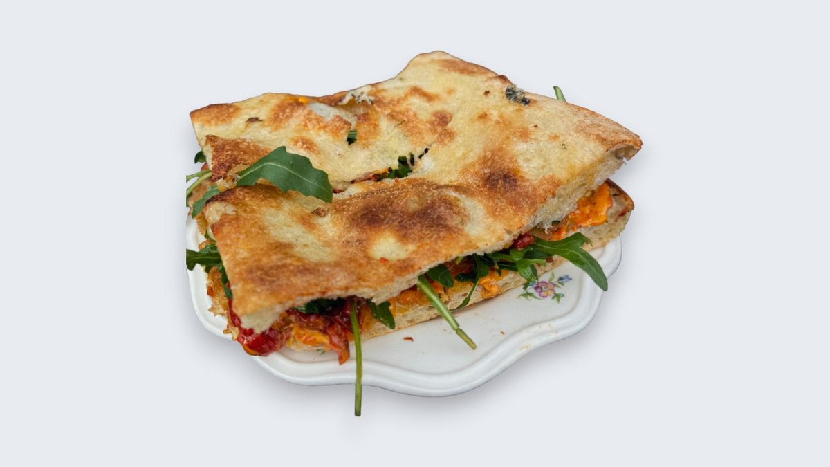 Фокача лепче, печени маринирани тиквички, печени маринирани пиперки, сушен домат, веге мајонез, рукола.