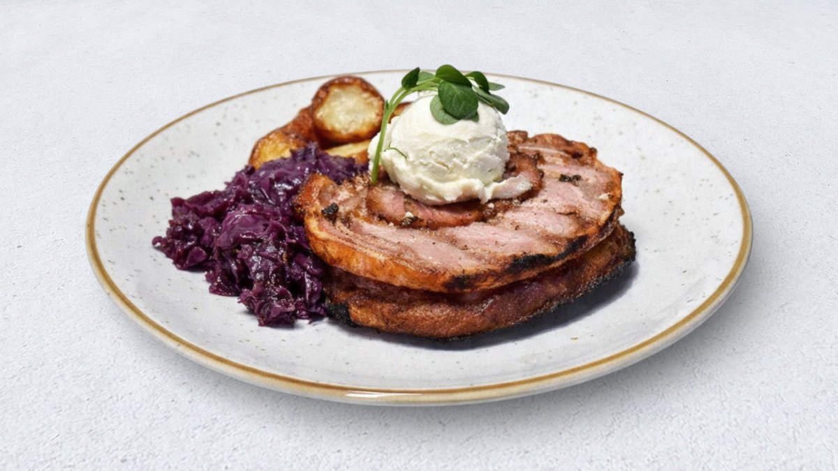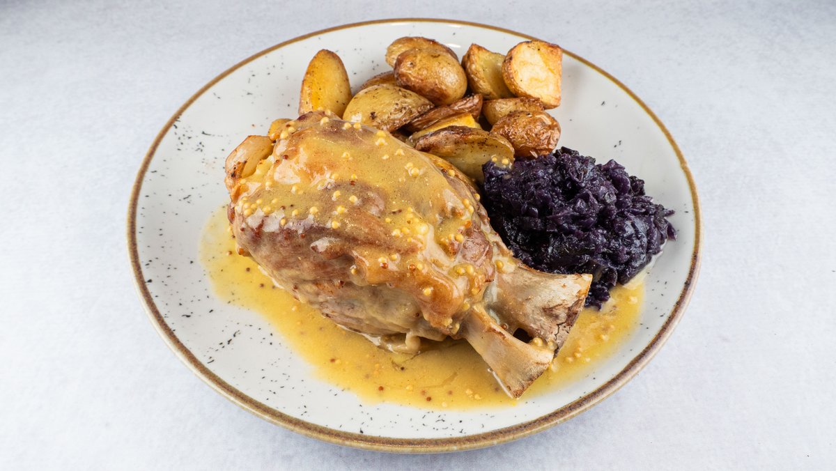 Бавно подготвувана свинска коленица во сос од сенф, бејби компир и динстана црвена зелка