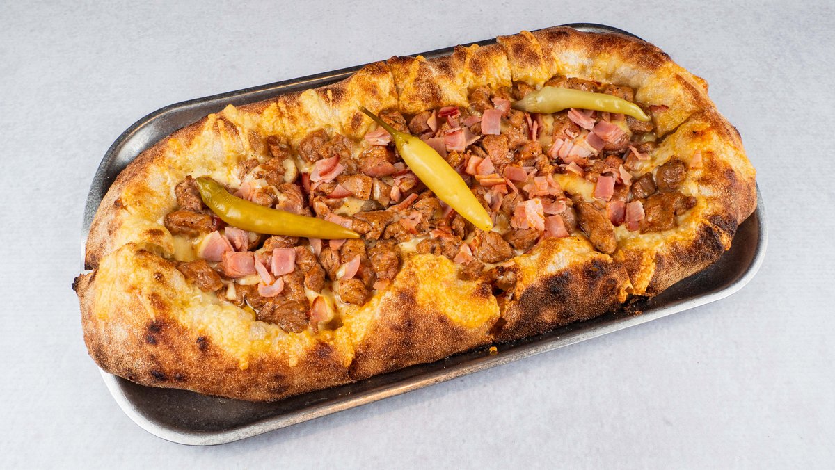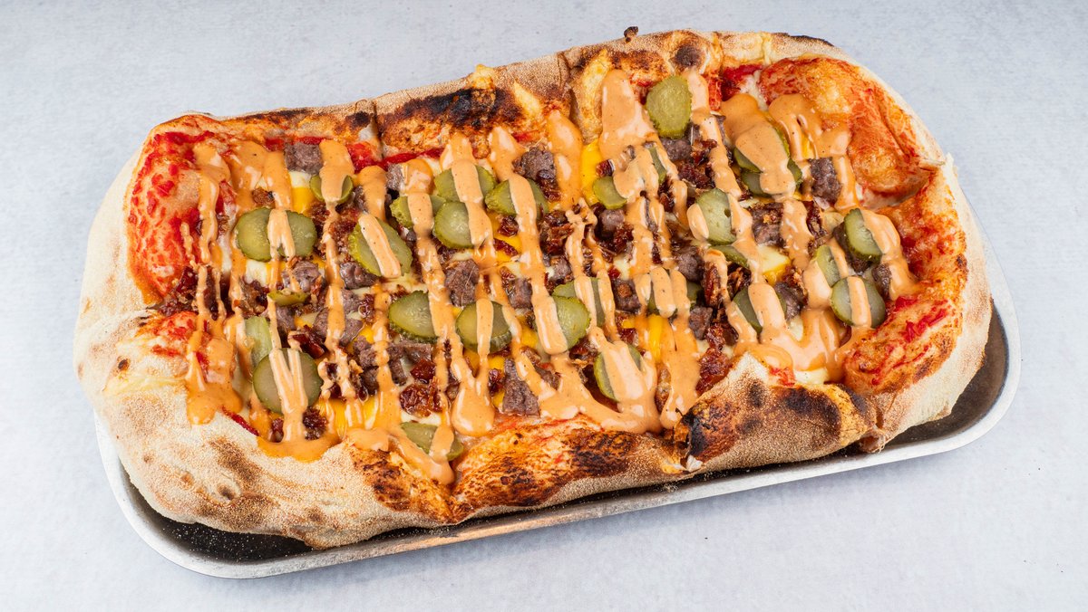 Доматен сос, топени гауда и чедар, јунешко мелено месо, џем од сланина, кисели краставички, бургер сос
