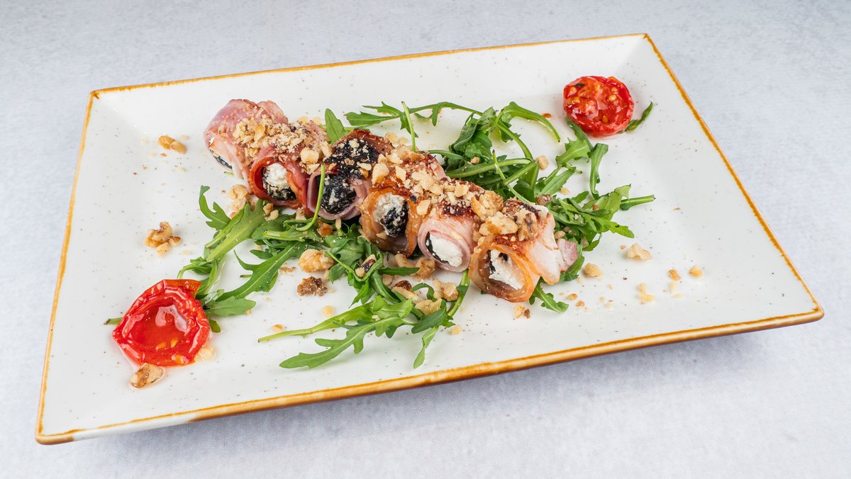 Суви сливи полнети со козјо сирење, ролувани во сланина и потпечени