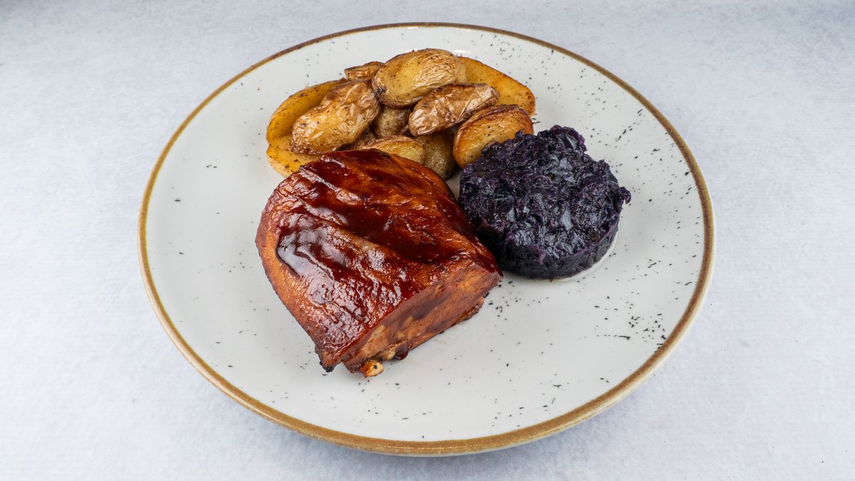 Свински ребра во фурна, запечени со BBQ сос, бејби компир и динстана црвена зелка