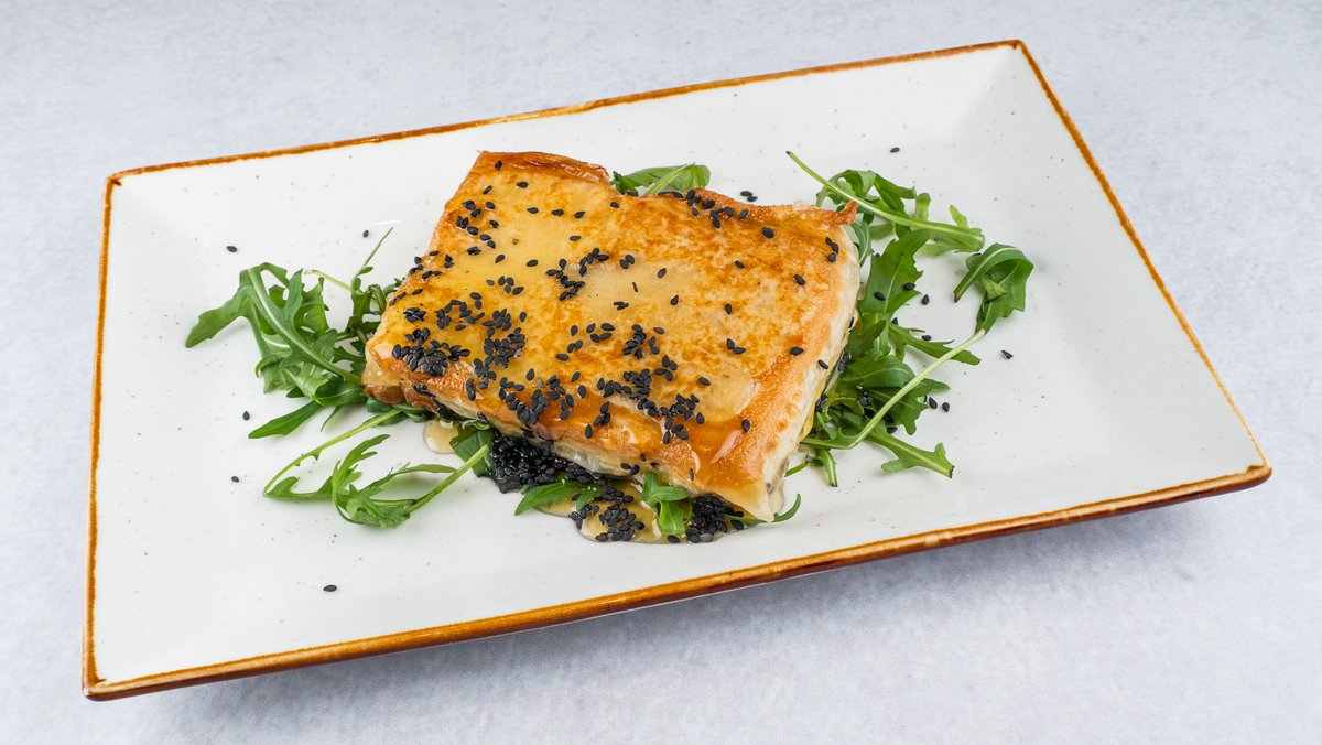 Кравјо сирење завиткано во кора и потпечено, прелиено со мед и црн сусам