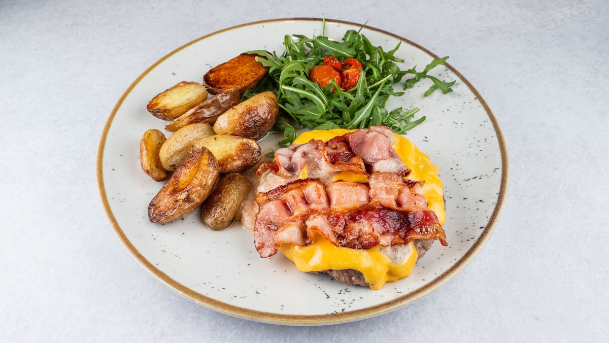 100% јунешка плескавица од 300f, полнета со гауда и кисели краставички, прелиена со топен чедар и коцки од сланина, салата