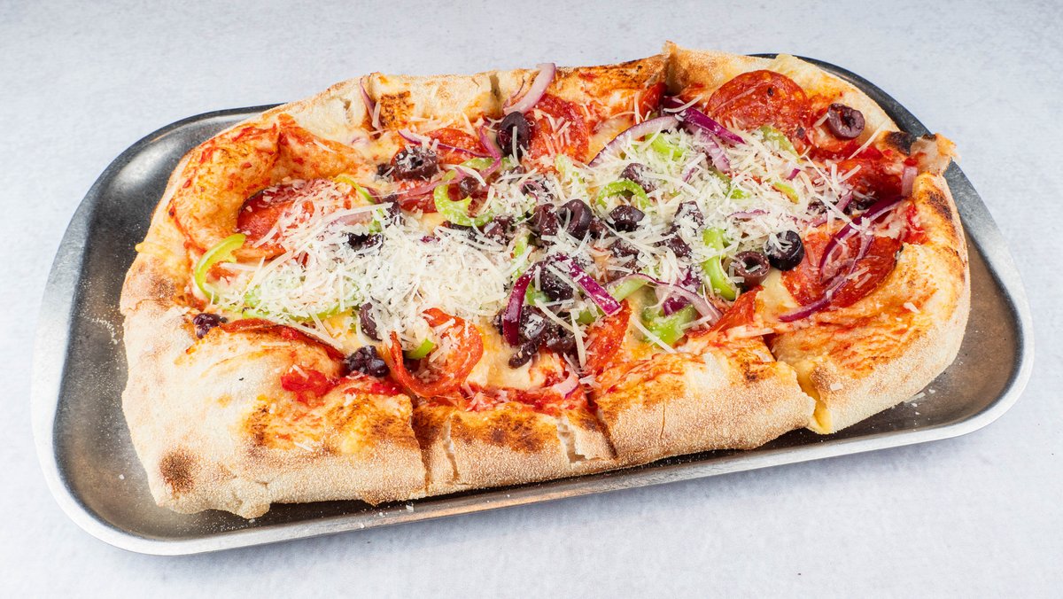 Доматен сос, топена гауда, пармезан, кулен, кромид, пиперка, маслинки