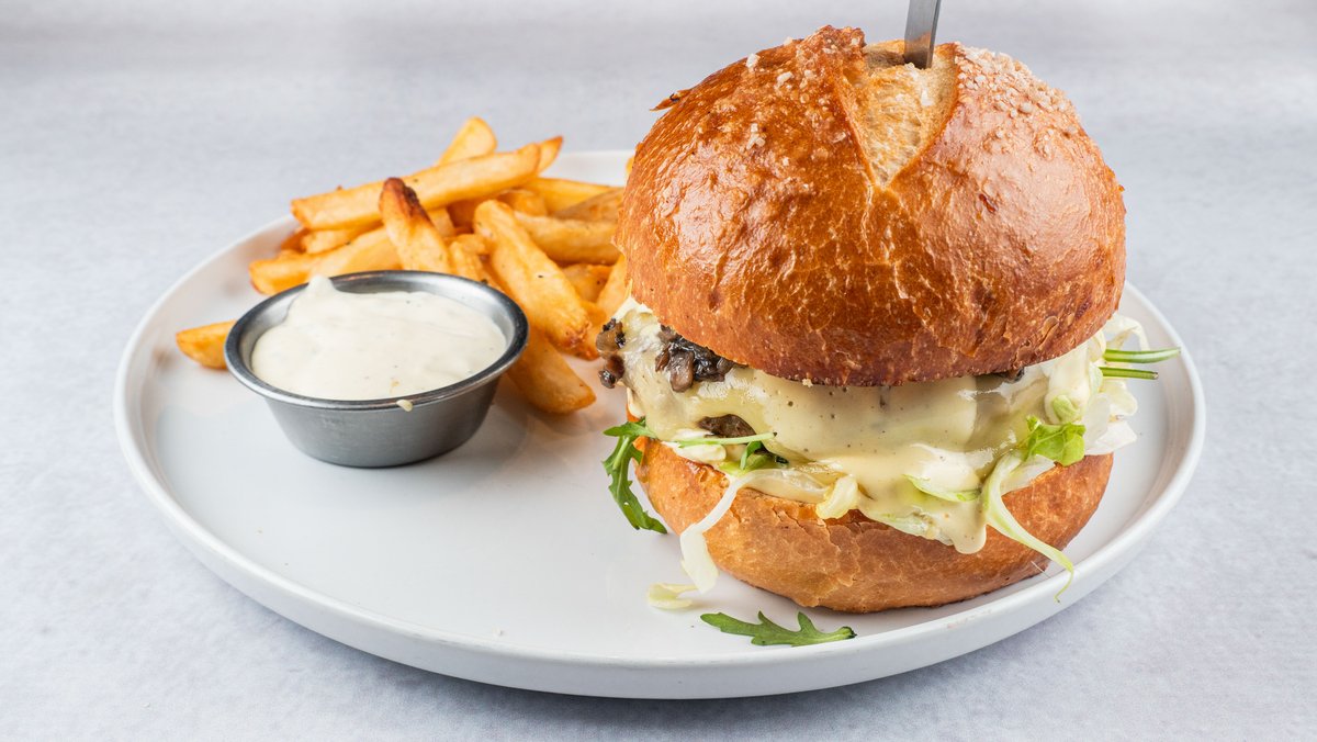100% јунешка плескавица од 180g, умами печурки, растопена гауда, сенф ремулада сос, микс зелена салата