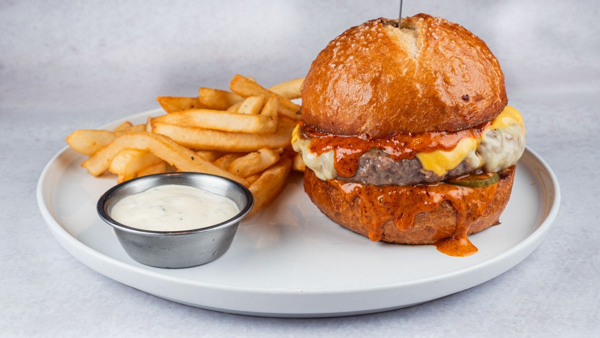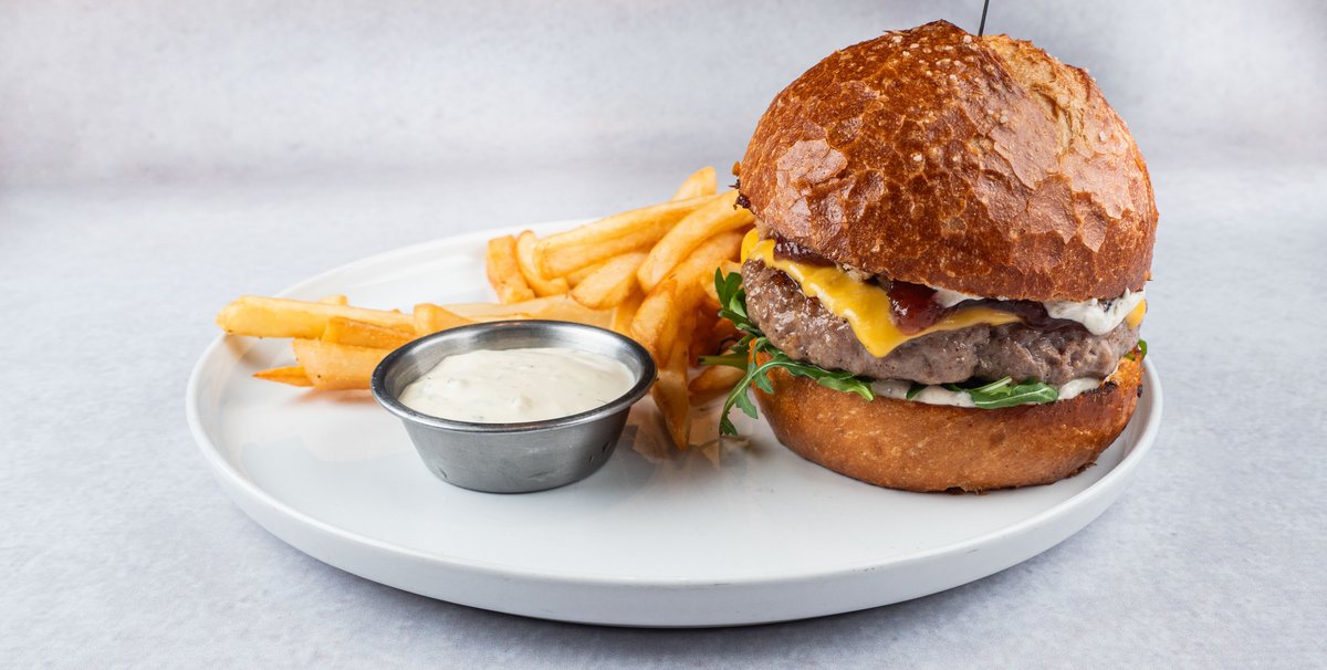 100% јунешка плескавица од 180g, пикантен Њу Јоркер сос, растопени гауда и чедар, карамелизиран кромид и кисели краставички