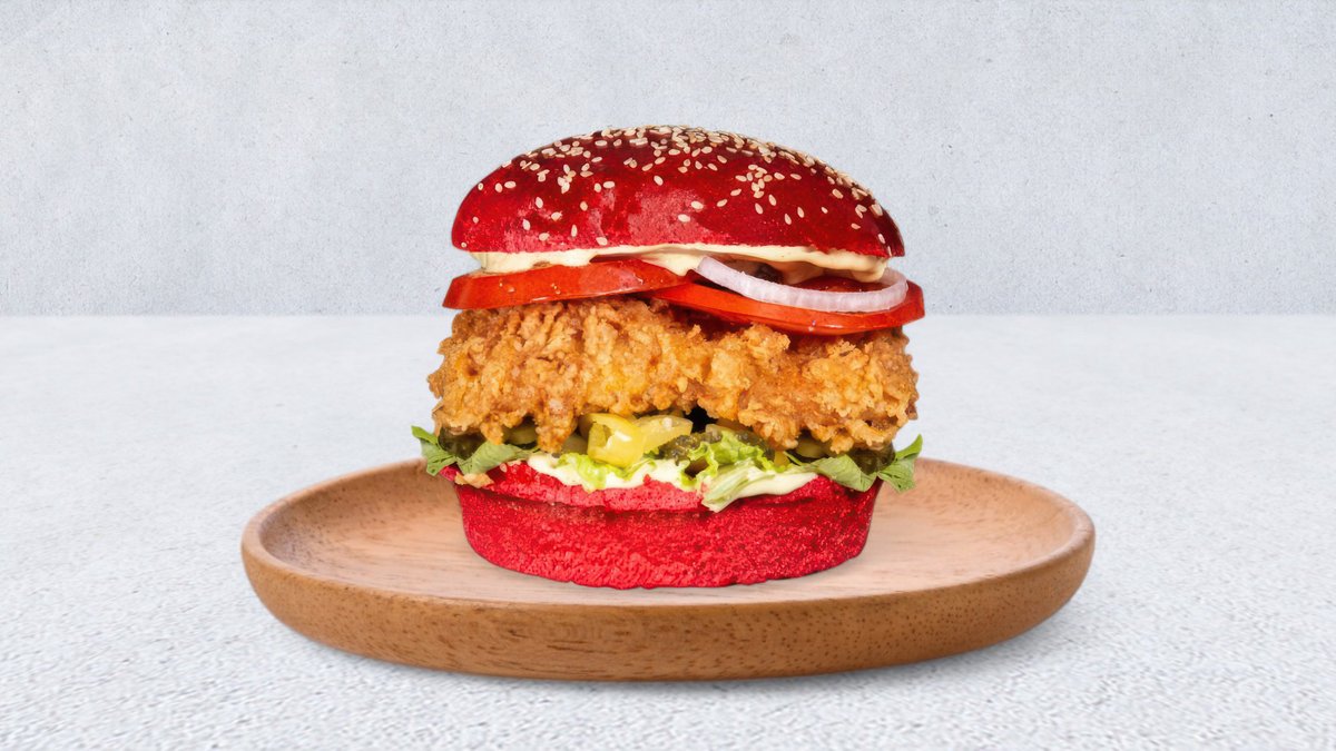 Црвено бриош лепче, похован пилешки стек со корнфлекс, пикантен Full Moon сос, феферони, марула, кисели краставички, домат, кромид