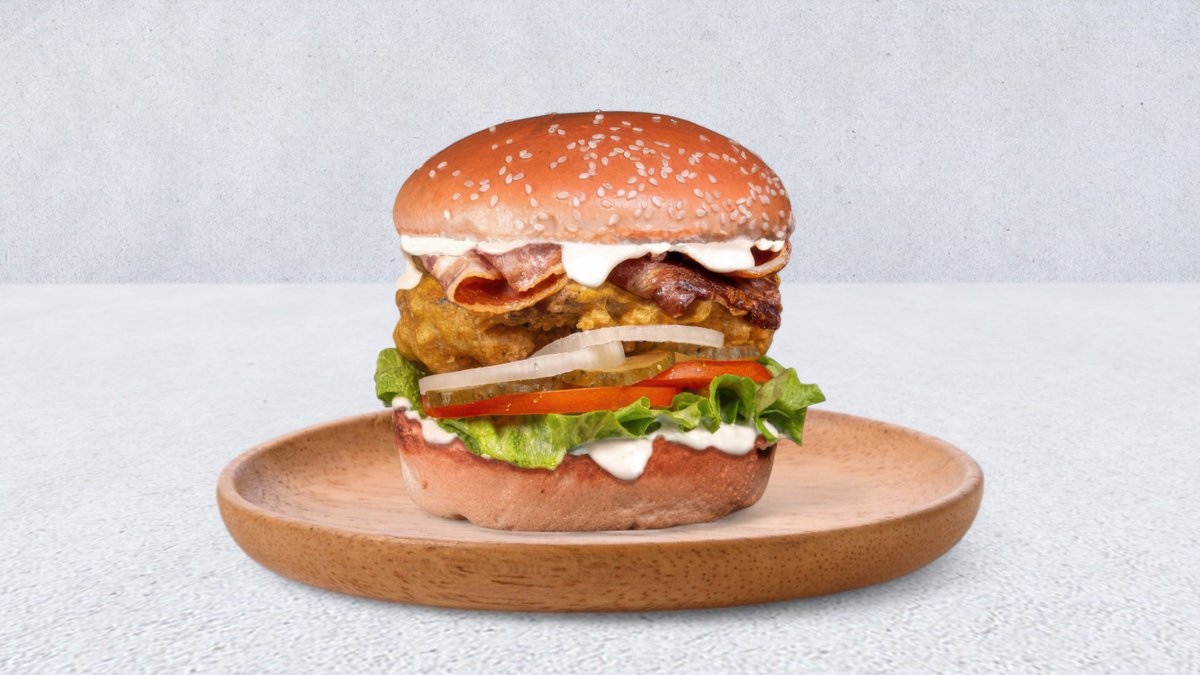 Црно бриош лепче, похован пилешки стек со корнфлекс, карамелизирана сланина со јаворов сируп ×2, чедар кашкавал, чипотле мајонез, марула, кисели краставички, домат, кромид