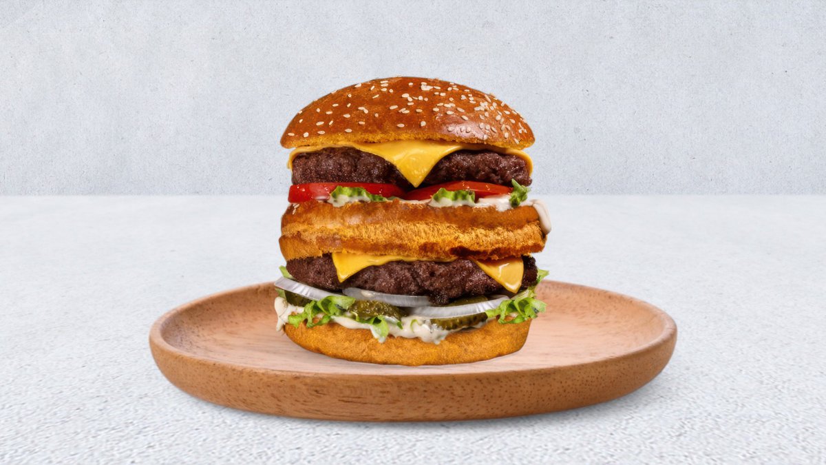 Жолто бриош лепче, 100% јунешка плескавица ×2, чедар кашкавал ×2, Yellow сос, ајсберг, домат, кисели краставички, кромид
