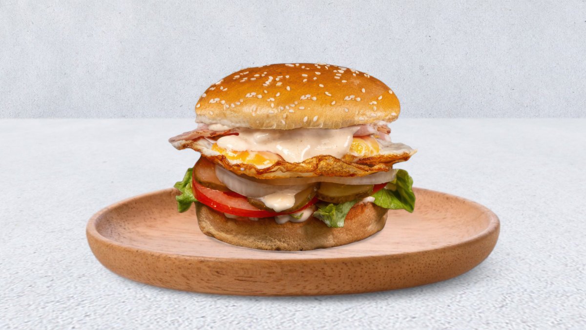 Бриош лепче, 2 јајца на око, Big Bang сос, сланина, чедар кашкавал, кромид, домат, кисели краставички, ајсберг салата
