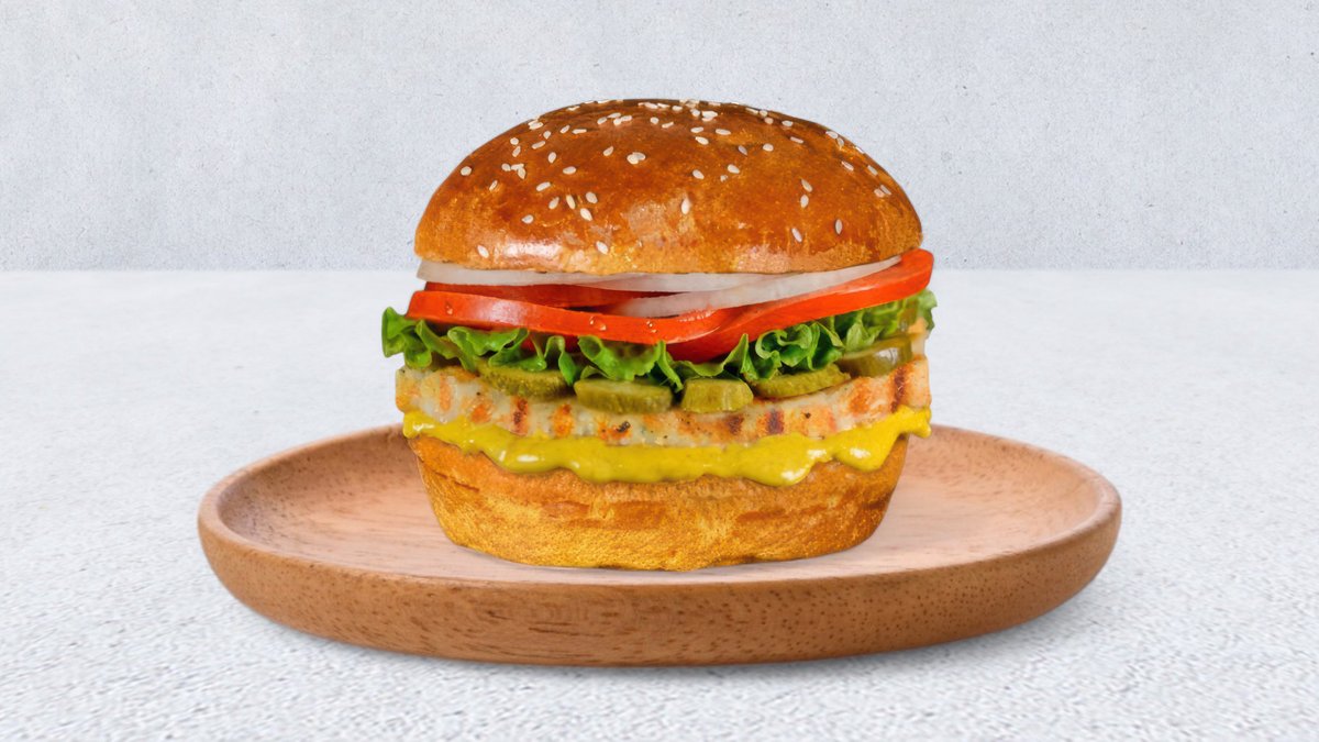 Бриош лепче, похована пилешка плескавица со корнфлекс полнета со гауда кашкавал, ранч сос, марула, кисели краставички, домат, кромид