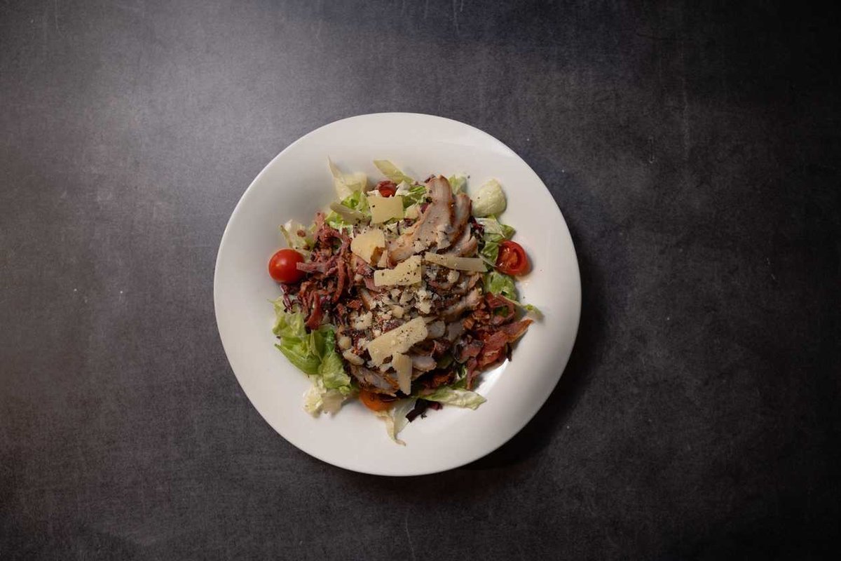 Grilled chicken breast served on a crispy green salad, cherry tomatoes, crispy bacon, parmegiano cheese, croutons and topped with caesar dressing