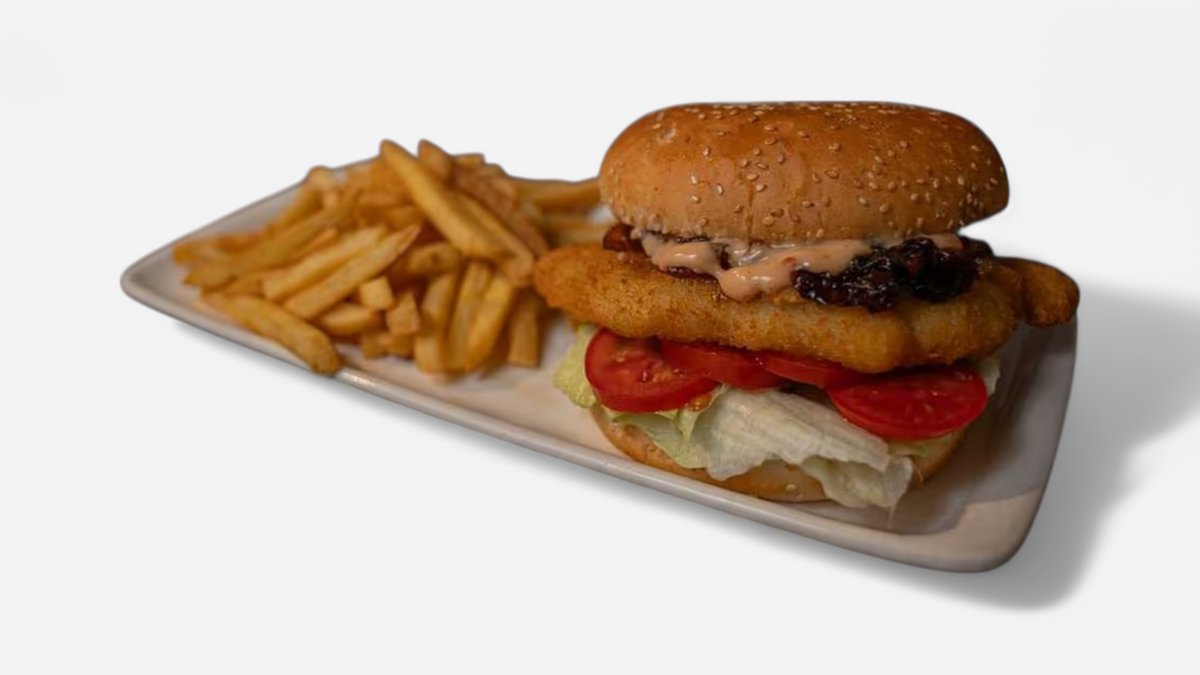 Battered crispy chicken fillet, iceberg lettuce, sliced tomatoes, caramelised onions and sriracha mayo