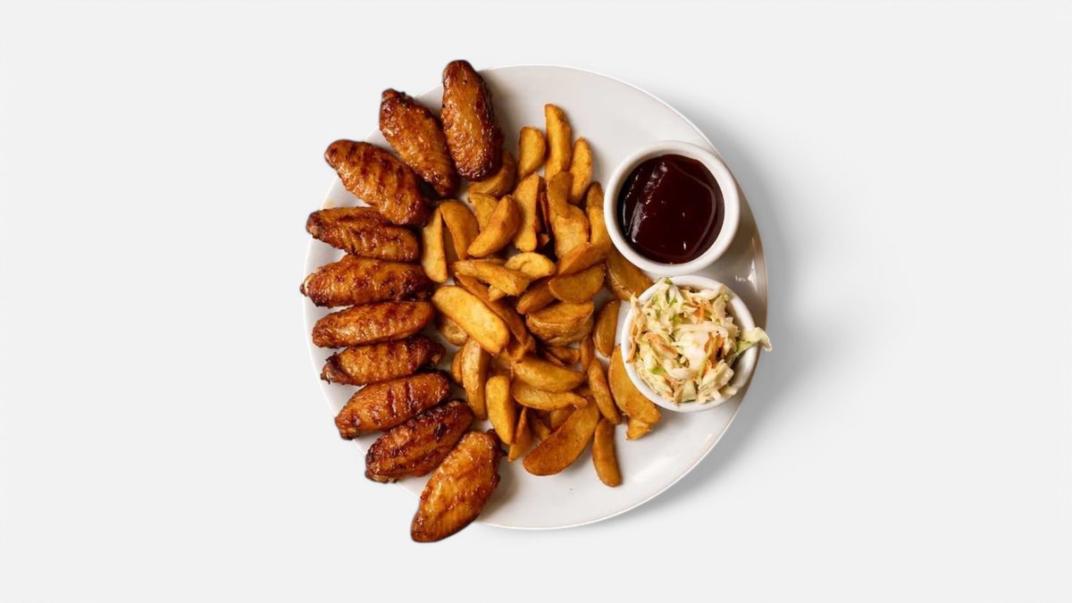 10 pcs of chicken wings served with potato wedges, coleslaw and bbq sauce