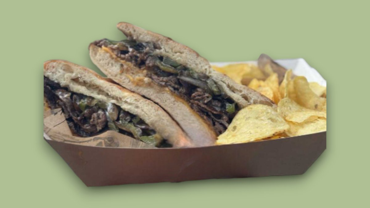 Beef strips, green peppers, onions, cheese, garlic mayo