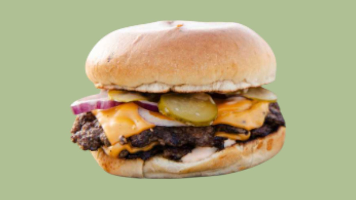 Two smashed beef patties, cheese, onions, gherkins, and burger sauce.
