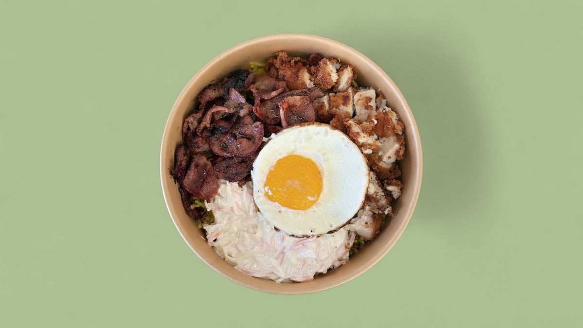 Crispy chicken, homemade rice salad, coleslaw, crispy bacon, fried egg