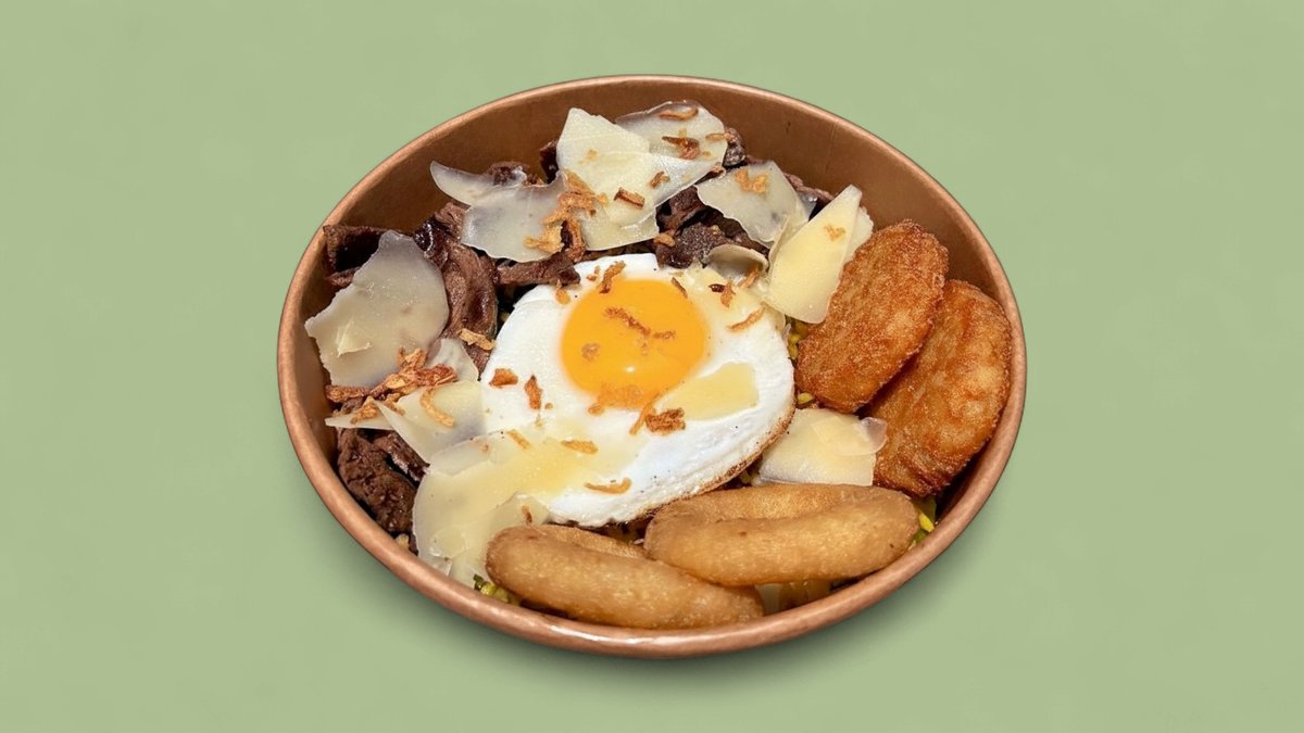 Crispy beef, homemade rice salad, fried egg, hash browns, onion rings, parmesan shavings