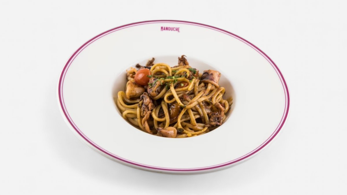 Tuna, onions, black olives, cherry tomatoes, basil, mint, mozzarella, Manouche tomato sauce and sesame seeds