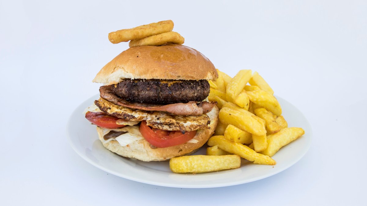 Beef patty, burger bun, lettuce, tomato, onions, bacon, eggs, 2 onion rings, burger sauce