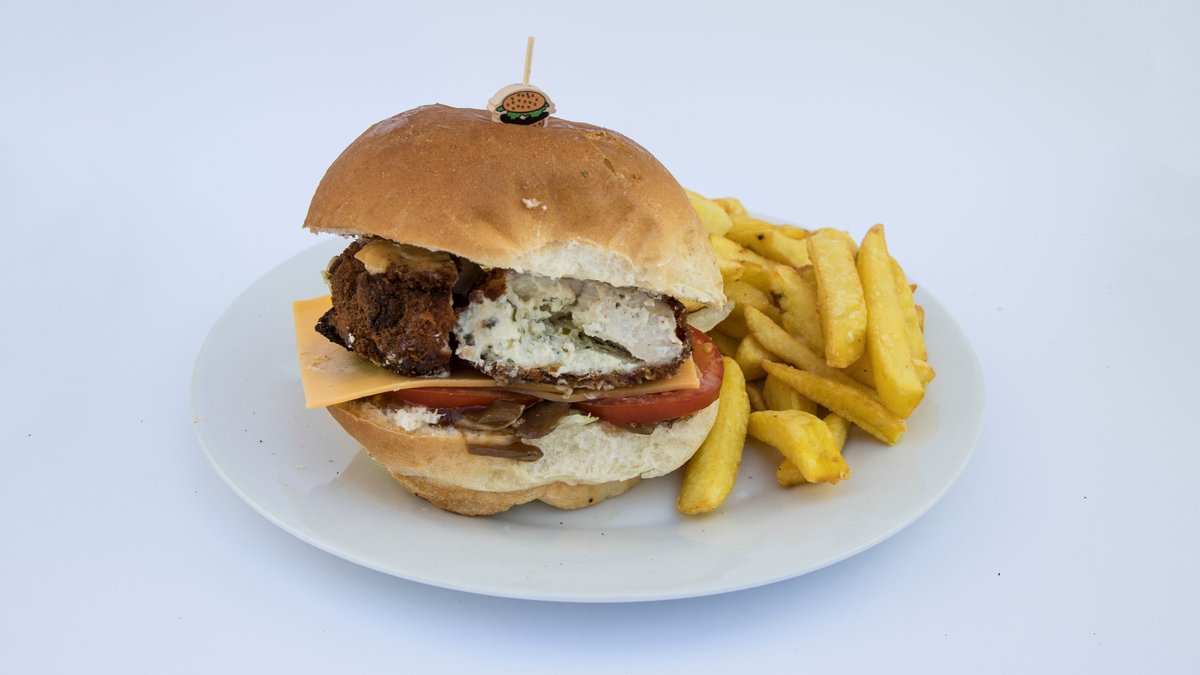 Chicken kiev burger, burger bun, onions, tomato, lettuce garlic, mayo