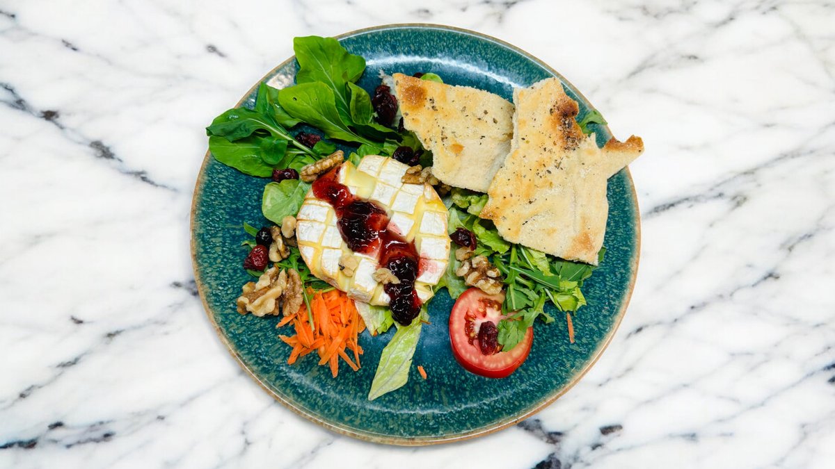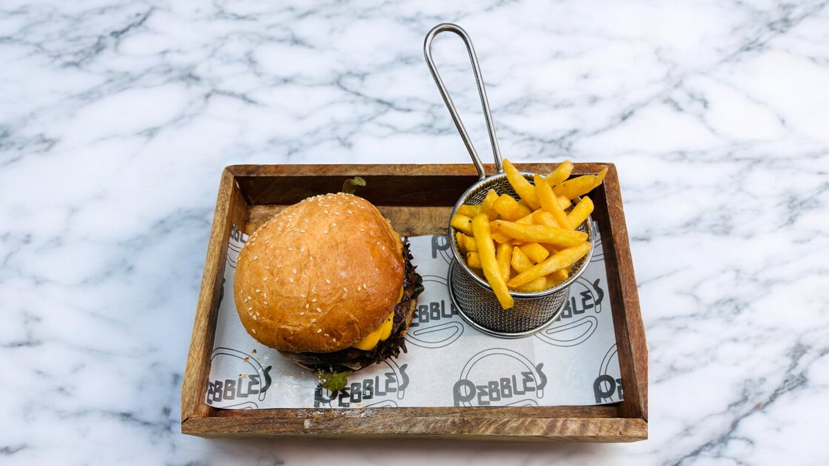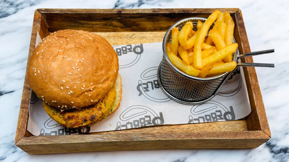 Breaded patty packed with vegetables and served with caramelised onions, lettuce, tomatoes and fries