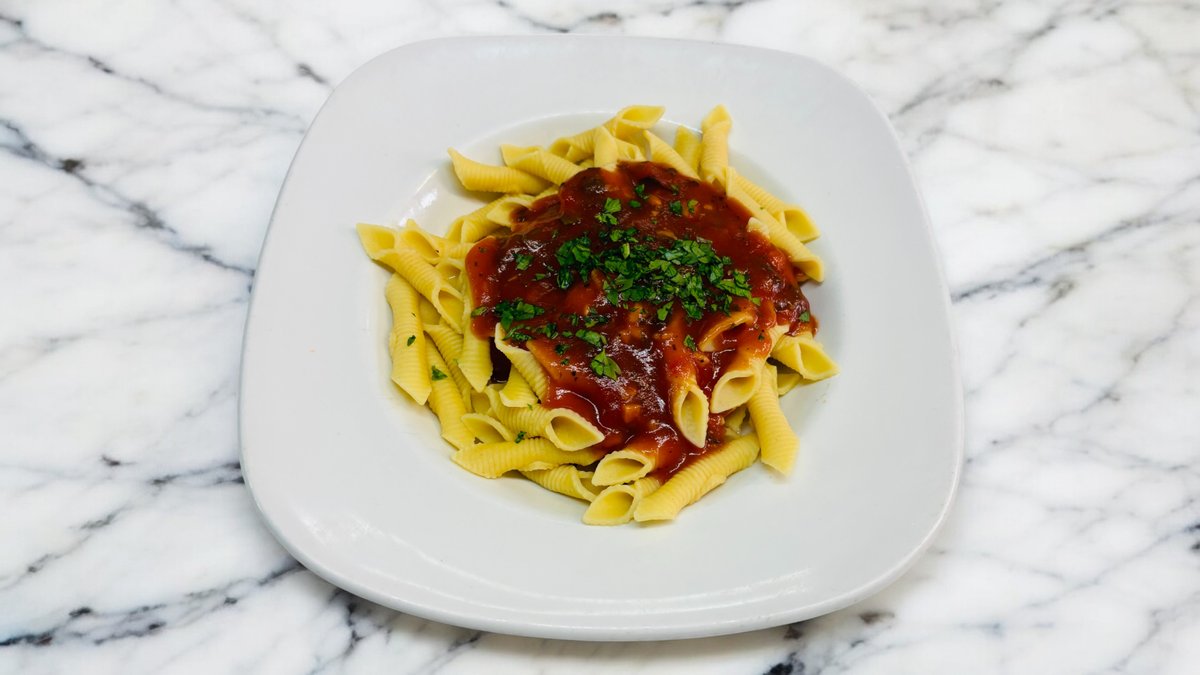 Local rabbit with garlic, onion, wine, garden peas and a touch of tomato sauce