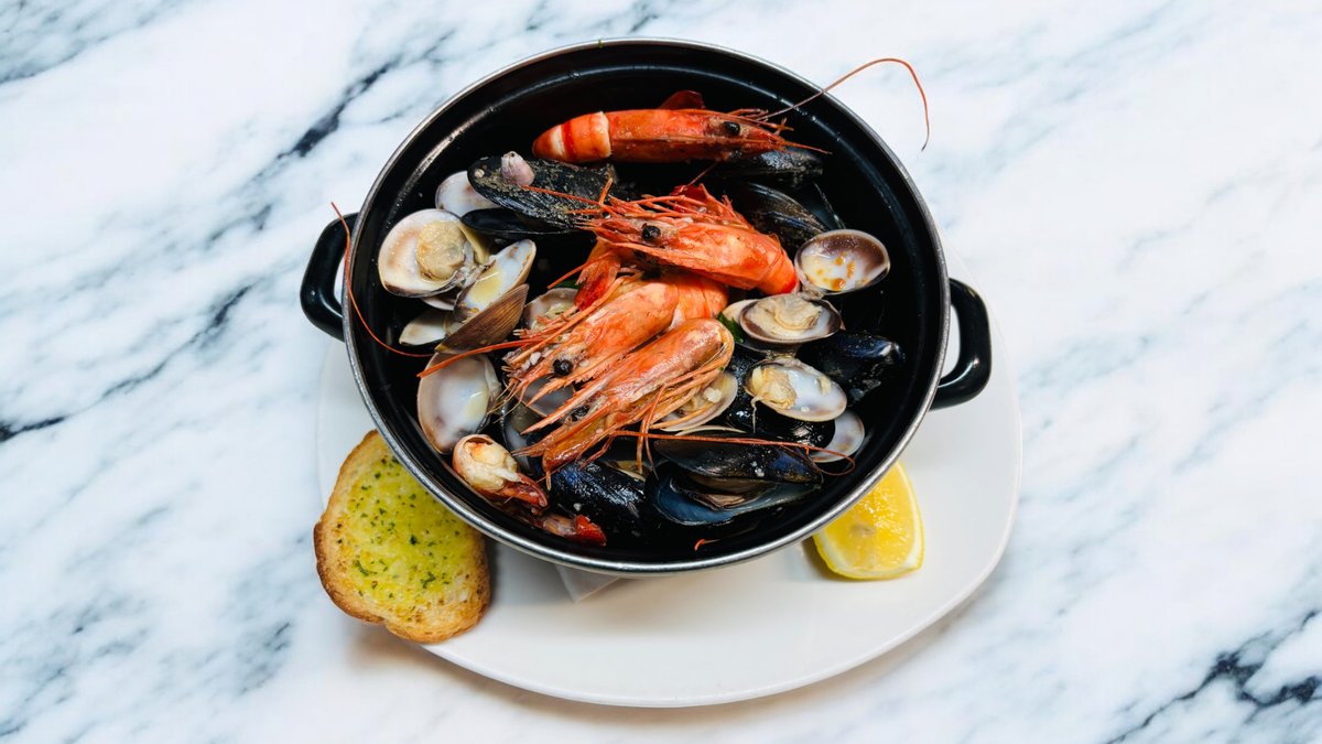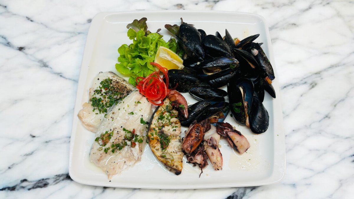 Fresh mussels, prawns, calamari, shrimps, mussels meat, cooked in white wine, garlic, local herbs and a touch of tomato sauce